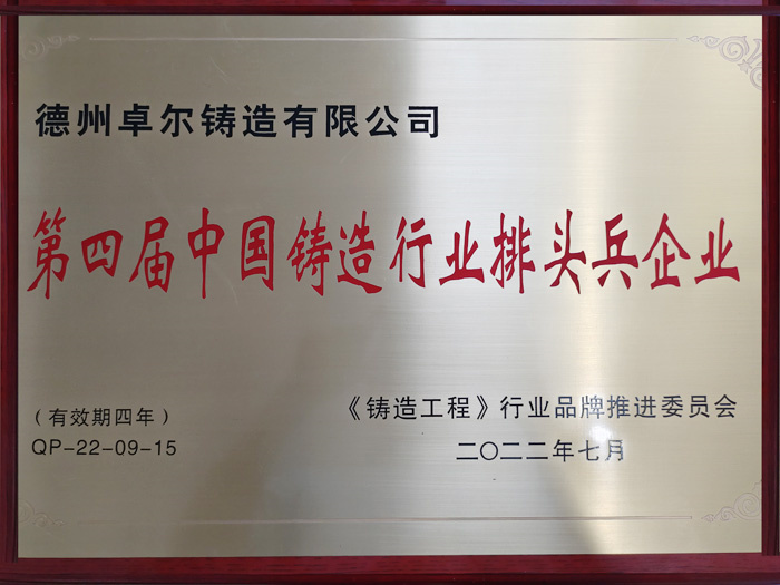 2022年7月25日,第九屆全國鑄造行業(yè)發(fā)展論壇暨中國鑄造協(xié)會第九界會議代表大會在天津勝利召開,德州卓爾科技有限公司榮獲“第四屆中國鑄造行業(yè)排頭兵企業(yè)”及“第四屆鑄造行業(yè)機床鑄件分行業(yè)排頭兵企業(yè)”榮譽稱號